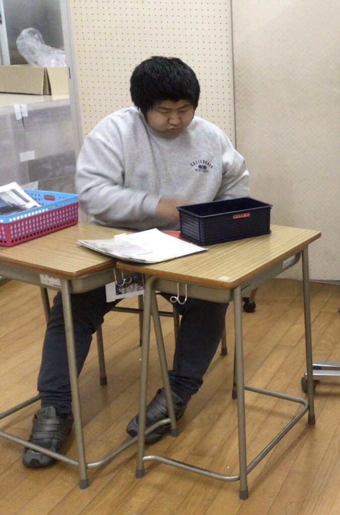 中学部は後期の校内実習を頑張っています。この度も青山商事株式会社井原商品センター様からの資材提供を受け、充実した実習を行うことができています。本物の商材を前に生徒たちも緊張感をもって作業に取り組んでいます。「丁寧に作業をする」、「時間いっぱい作業をする」、「正確に報告をする」などの個人目標を意識しながら、生徒たちは真剣に精一杯頑張っています。