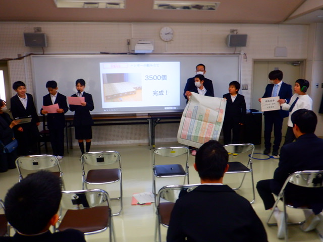 中学部の校内実習最終日の午後に実習報告会をしました。本日は参観日だったので、保護者の方に実習報告会を参観していただきました。生徒たちは校内実習で仕上げた出来高を発表したり、自分の目標と成果を発表したりしました。発表する生徒たちの顔には校内実習を一週間やり遂げた達成感が表れていました。