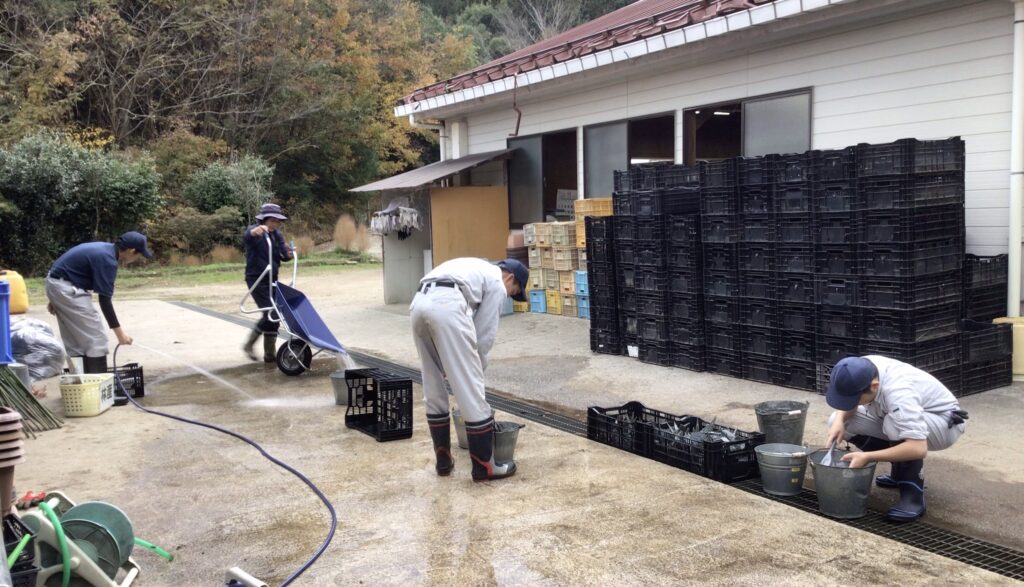 実習2週目がスタートしました。校内実習1グループは、先週「5分前には自分の持ち場に戻り、仕事再開までに体制を整える」ことを心掛けて行動しました。そのためには、自分で時計を確認したり、短い休憩時間に何をすべきかを判断したりしなければなりません。毎日繰り返し意識することで習慣化できるようにしたいです。今日は農産班からの委託作業(屋外作業)で道具の洗浄・片付け、大豆のはぜかけを協力して行いました。はぜかけでは、「選別するときに効率を考えて工夫しました。」とやり方を話す生徒もおり、みんなでよりよく作業するために考えている様子が伺えました。2グループは、実習中の動きについて見通しをもつことができているので、自ら必要なものを準備するとすぐに席に座り仕事を始めます。また、休憩時間の終わりを知らせるタイマーが鳴ると、意識を切り替えて次の活動場所へ移動するなど、落ち着いて自分から行動する姿が見られています。現場実習は、巡回を行った教員から「〇〇を頑張っていました。」「前期より〇〇が改善しています。」など、それぞれ頑張っている様子が聞こえてきます。今週は寒くなりそうですが、体調管理に努め、最後までやりきってほしいと思います。