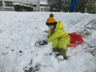 今年も健康の森に雪が降り、つどいの広場にも雪が積もりました。そうなると健森の子どもたちは、やっぱり雪遊びがしたい!雪遊びができる格好に着替えたら、いざ出発!と子どもたちは外に飛び出していき、元気いっぱい雪で遊びました。まだ雪が舞っていましたが、子どもたちはそんなことはお構いなしという様子で、雪玉づくりに、そりすべり、雪に飛び込み…と思う存分楽しんでいました。