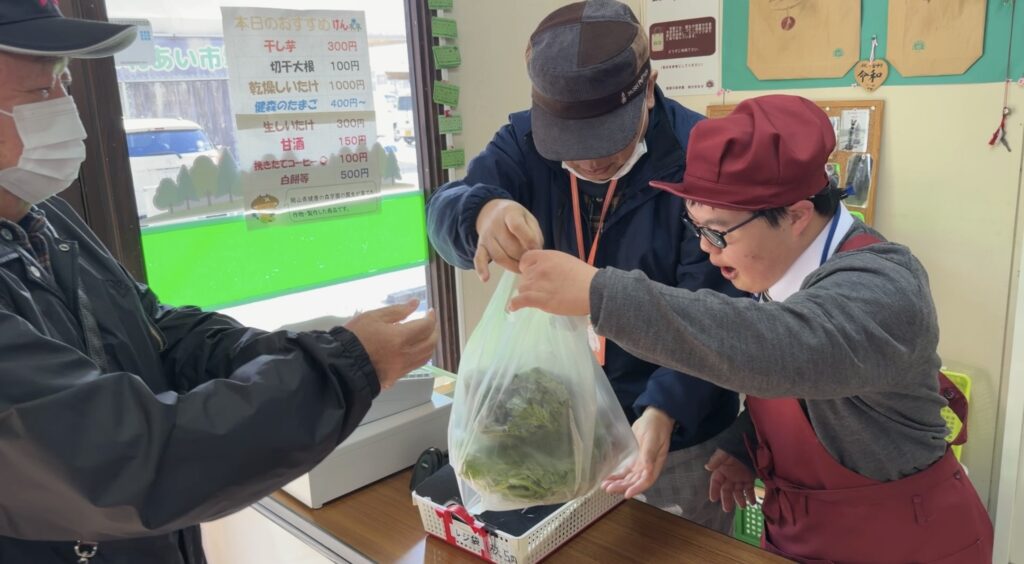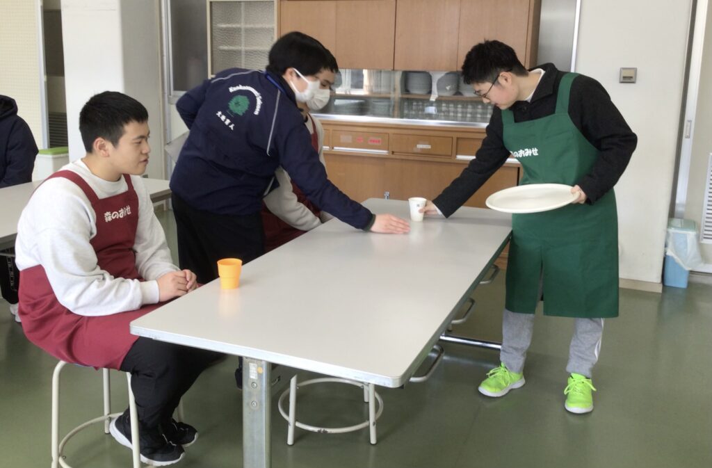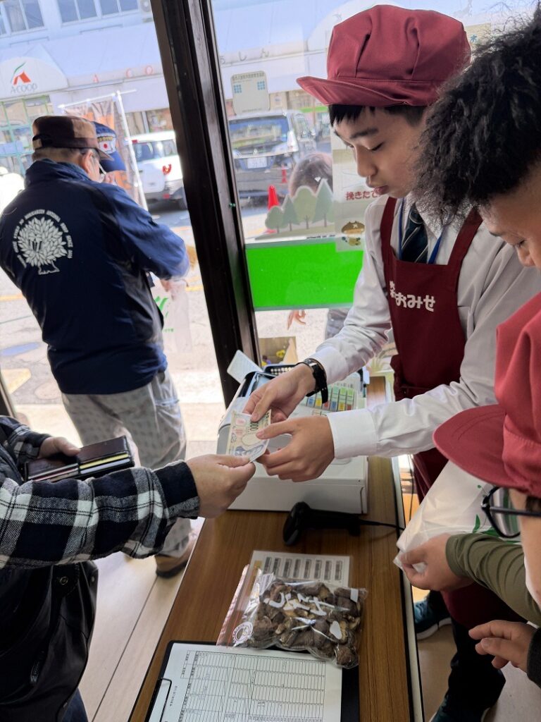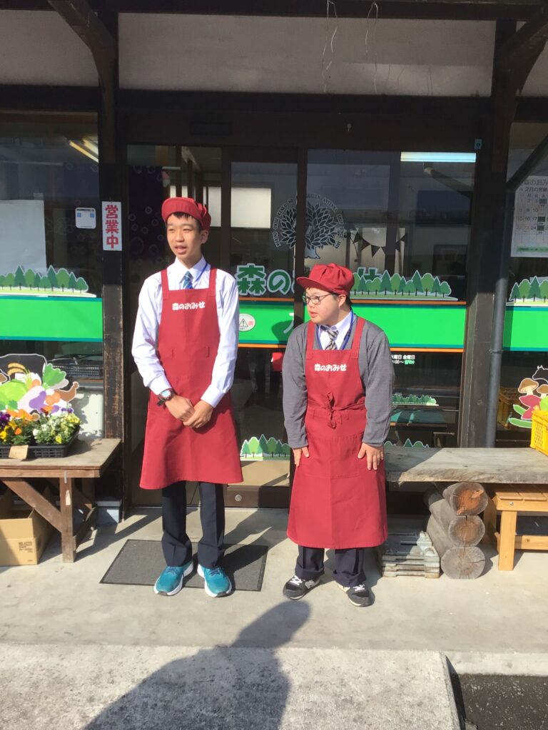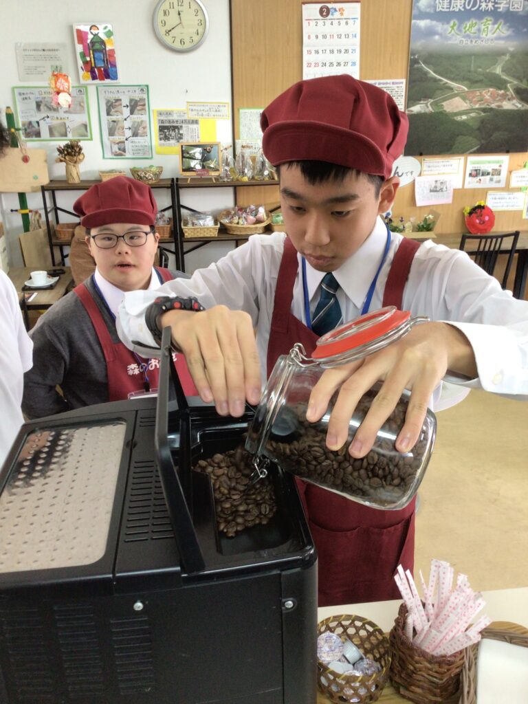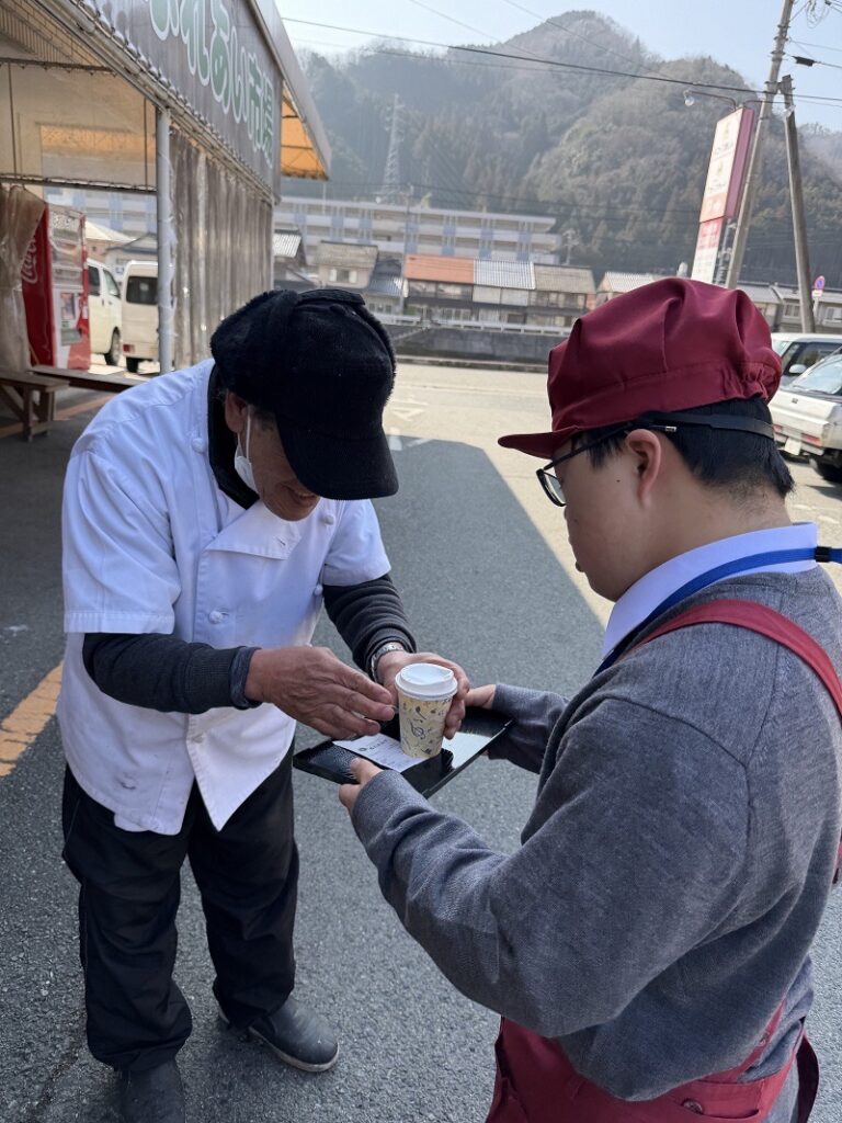 Aコープあしん店の駐車場に構えた「森のおみせ」、金曜日は高等部が運営しています。三学期から一年生も店頭に立ち、販売や接遇をしています。自分たちが作った製品をお客様が手に取ってくださったりコーヒーを注文してくださったりして直接やりとりすることができ、とても充実しています。これからもたくさんのお客様に喜んでいただけるよう練習を頑張ります。