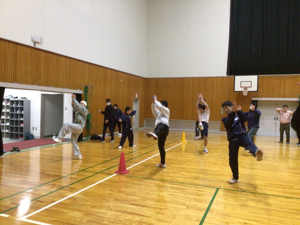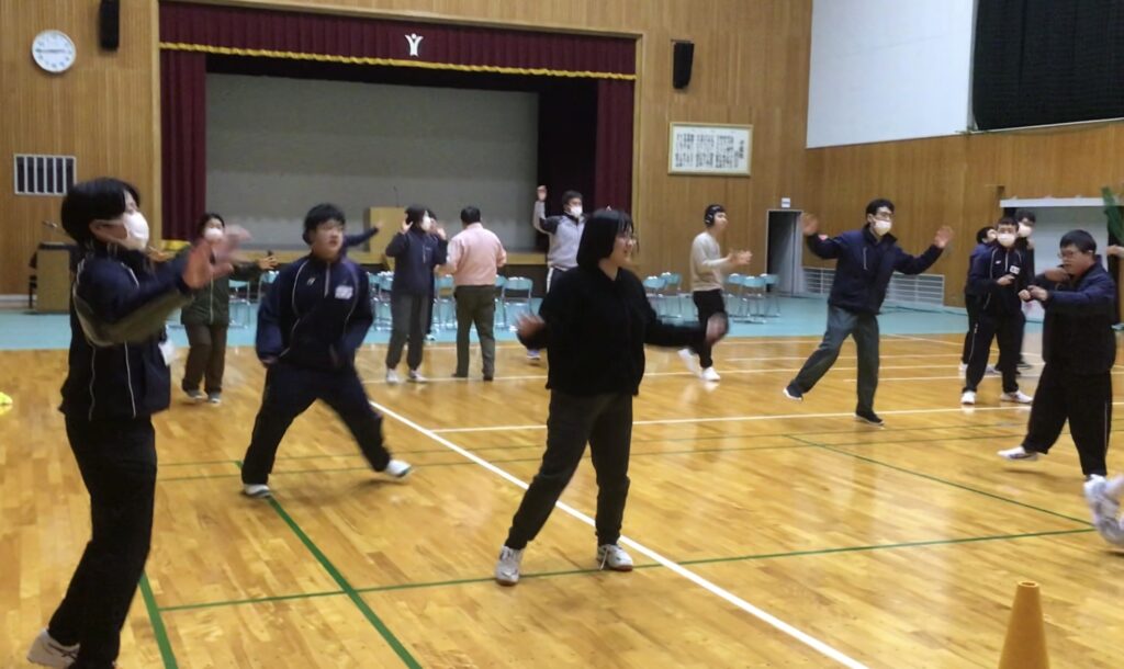 体育では、地域ボランティアで高羽先生をお迎えし、身体表現(ダンス)の授業を行いました。ミュージシャンVaundyの「怪獣の花唄」という曲に合わせた本格的なダンスで、細かなステップや素早い動きを楽しく教えてもらいました。細かいところは気にせず、みんなリズムにのって夢中で体を動かしていました。友達が踊る様子を見て途中から参加できた生徒、最後まで踊って汗びっしょりになった生徒もいました。三年生とともにする体育は今日が最後となりますが、また一つ楽しい思い出ができました。
