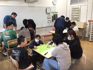 実習2週目がスタートしました。校内実習1グループは、先週「5分前には自分の持ち場に戻り、仕事再開までに体制を整える」ことを心掛けて行動しました。そのためには、自分で時計を確認したり、短い休憩時間に何をすべきかを判断したりしなければなりません。毎日繰り返し意識することで習慣化できるようにしたいです。今日は農産班からの委託作業(屋外作業)で道具の洗浄・片付け、大豆のはぜかけを協力して行いました。はぜかけでは、「選別するときに効率を考えて工夫しました。」とやり方を話す生徒もおり、みんなでよりよく作業するために考えている様子が伺えました。2グループは、実習中の動きについて見通しをもつことができているので、自ら必要なものを準備するとすぐに席に座り仕事を始めます。また、休憩時間の終わりを知らせるタイマーが鳴ると、意識を切り替えて次の活動場所へ移動するなど、落ち着いて自分から行動する姿が見られています。現場実習は、巡回を行った教員から「〇〇を頑張っていました。」「前期より〇〇が改善しています。」など、それぞれ頑張っている様子が聞こえてきます。今週は寒くなりそうですが、体調管理に努め、最後までやりきってほしいと思います。