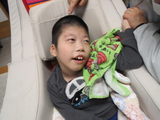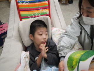 訪問教育生も頑張っています。担任の先生に絵本を読んでもらい、声を聴いたり絵を見たりして勉強しています。また、手を握ってもらったり握り返したりと先生を意識しながら勉強に励んでいます。