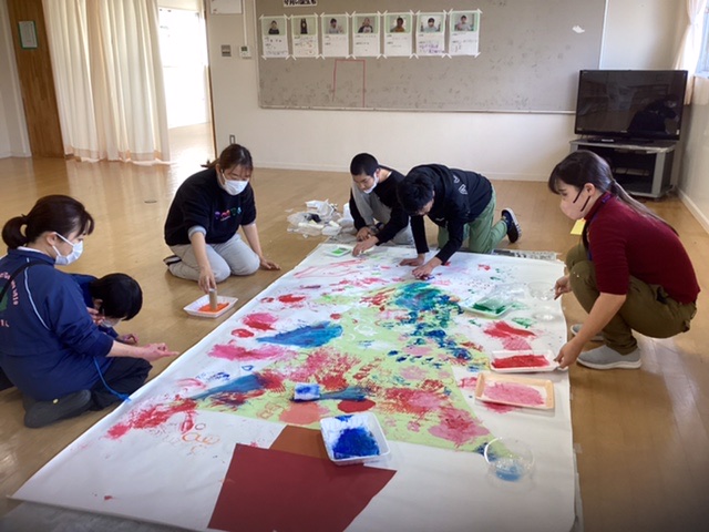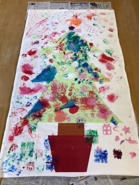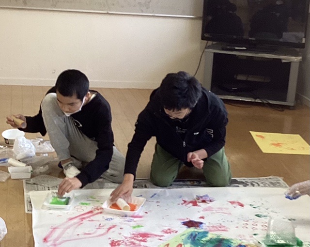 今日は気温がグッと下がり、健森ではお昼頃からは雪がチラチラと舞う、寒い1日となりました。午後からの水曜日運営では、ユアタイムで希望者が集まって大きなクリスマスツリーの制作に取り組みました。インフルエンザの感染拡大予防で、棟間交流としての取り組みを見送り、各棟に分かれて行いました。絵の具や廃材のスタンプを使って、男子棟ではツリーのベースを、女子棟では色画用紙にデコレーションすることで、それぞれ制作活動を行いました。完成したら正面玄関に飾っていただく予定です!是非見にきてください。おやつの時間は、誕生者紹介でケーキを食べました。イチゴとサンタが飾ってあり、ひと足早いクリスマスの雰囲気を感じることもできました。