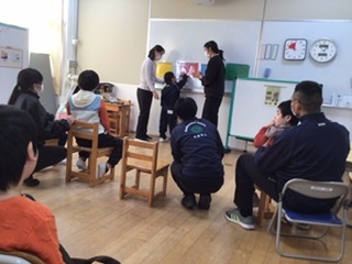 昨日、小学部にALTが来ました。まず先生に自己紹介をしてもらいました。その後、自分たちでも自己紹介を英語で挑戦しました。「こんにちは。」「私の名前は〇〇です。」「はじめまして。」などの言葉をALTの手本を見ながら真似をしました。また、絵本を英語→日本語で読んでもらい、絵本に出てきた色を当てるゲームもしました。英語の音にたくさん触れることができました。