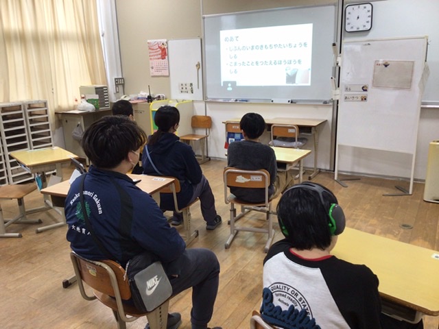 中学部では、SOSが上手に出せることをめあてに人権教育を行いました。感染症対策で、各学年の教室を遠隔で結んで、教室ごとに開催しました。自分の体調がすぐれない時に気づいたり、自分の気持ちが良くないことに気づきたりすることをプリントを使って学習しました。次にそのことを周りの人に伝えていくため、伝える人が誰かを考えていきました。生徒一人一人が上手にSOSが出せるようになると良いと思います。