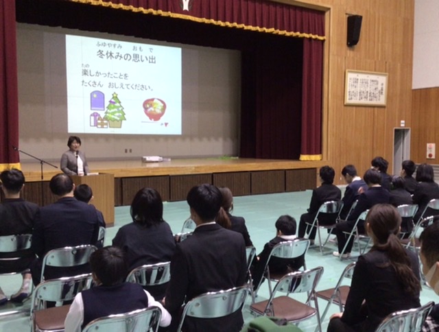 令和7年度第3学期始業式を行いました。校長先生がお話の中で、「今年の干支は?」と聞かれると、「午です」と答える児童生徒の元気な声が聞こえてきました。また、PC検定の認定証の伝達も行われました。各教室では冬休みの思い出を先生や友達に話している児童生徒の姿が見られました。