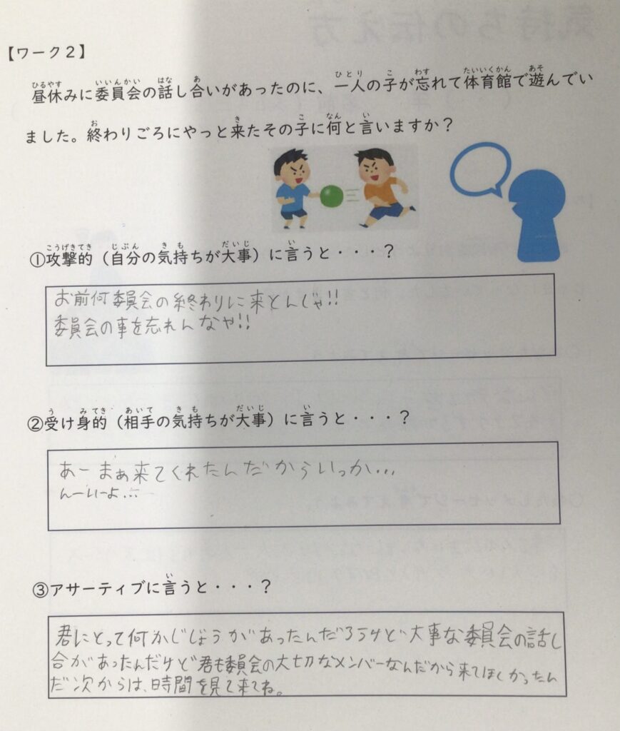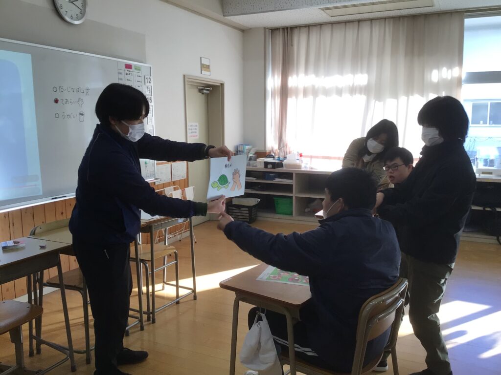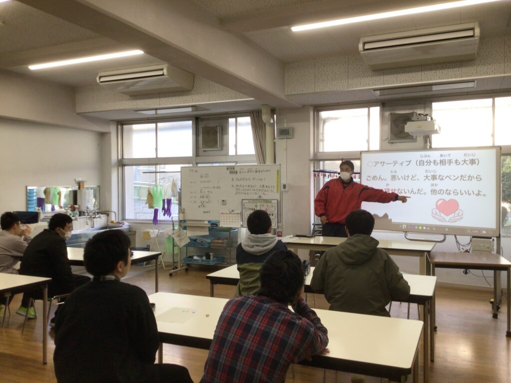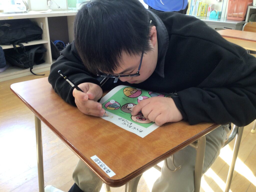 保健学習は2グループに分かれて「自分」を大切にする方法について学習しました。1グループのテーマは、「自分の気持ちの伝え方」です。いくつかの例をもとに「わたしメッセージ(自分の気持ちが大事なので攻撃的な言い方)」、「あなたメッセージ(相手の気持ちが優先されるので受身な言い方)」、そして自分も相手も大切にした「アサーティブな言い方」について考えました。友達や先生と話しながら、それぞれ自分の言葉で伝え方をまとめました。2グループは、一学期に学習した「体の部位」について復習しました。イラストに名称シールを貼ったり音楽に合わせて様々な部位を動かしたりと自分の体について意識を高めた後は、「手洗いの仕方」について学習しました。手洗いをはじめ、洗体、洗髪など、自分の体を清潔に保つことは、自分を大切にすることの核となります。「手洗い・うがい」は風邪から自分の健康を守ることに繋がる「自分でできること」です。心と体を守る方法を身に付けて、健やかな生活を送ることができるように日頃から心掛けましょう。