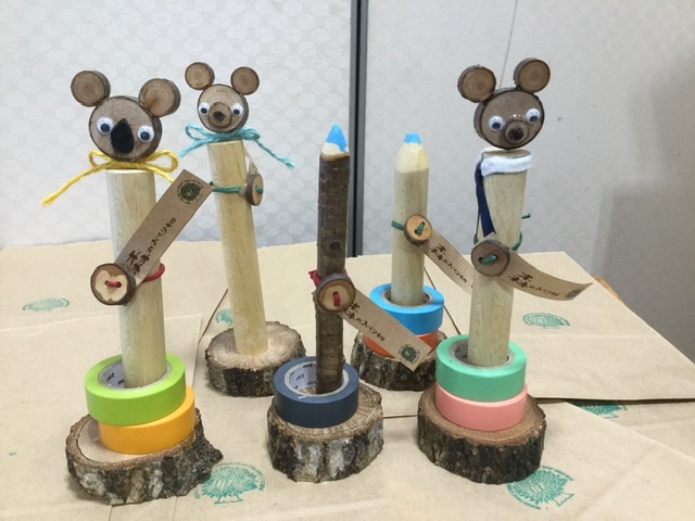 中学部の学部作業学習の時間に、園内の間伐や剪定で出た廃材を利用して健康の森らしい木の雑貨づくりしています。現在はゴロゴロ散らかりやすいマスキングテープをすっきり片付けられるようにと開発した新製品「マスキングテープホルダー」作りに取り組んでいます。製品に興味が持てるように、色鉛筆に見立てたり、可愛らしい動物の顔がついていたりする2種類を用意しています。鉛筆の先に色を塗ったり動物の顔になるように目・鼻・耳の小さなパーツをつけたり、枝や丸棒を土台にはめ込んだり、生徒一人一人が分担して仕上げています。