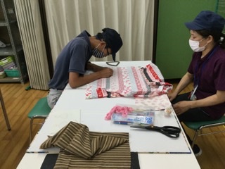 高等部2年生の作業学習、ハーブマスコット作りを紹介します。型取りから布裁断、ミシン縫い、手縫いまでの4つの作業工程を分担して製作しています。黙々と真剣な眼差し。作業中の教室はシーンと静まり返り、扇風機の音とミシンの音が聞こえる程度です。