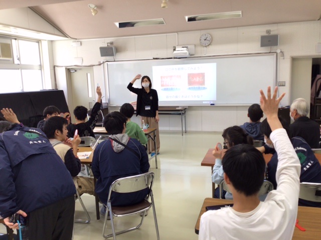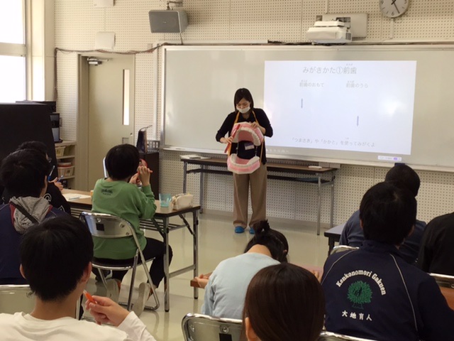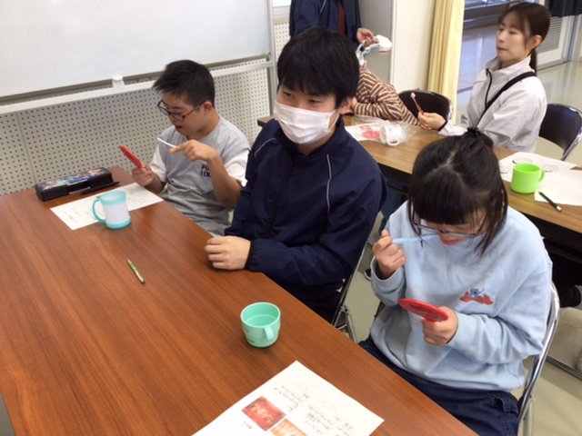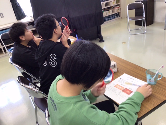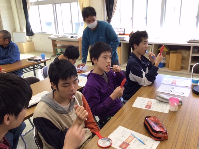 新見市福祉部の保健師さんを講師にお招きして、歯・口の健康教室を開催しました。保健師さんから「歯肉炎」や「むし歯」のお話を聞いた後、手鏡を使って自分の歯肉をチェックしてワークシートに記入しました。その後、保健師さんによる歯の磨き方の指導を受けながら自分で歯を磨きました。生徒たちは今日学んだことを、今後の歯・口の健康に生かしてくれることと思います。