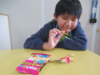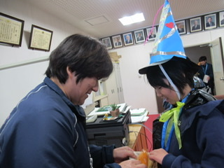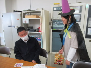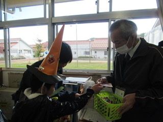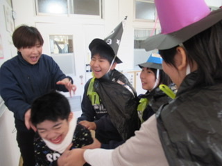 3組の生活単元学習で、ハロウィンパーティーをしました。児童はそれぞれ自分たちで作ったもので仮装して校内を歩きました。そして校長先生や教頭先生などに挨拶をしてお菓子をもらいました。もらった後も「ありがとうございます。」と挨拶することができました。教室に戻った後は、もらったお菓子をおいしくいただき、季節のイベントを楽しむことができました。