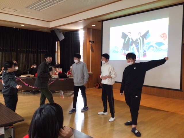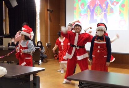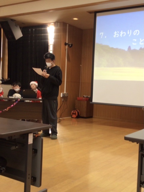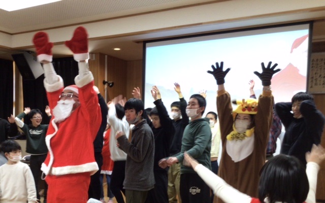 水曜日運営で、2学期のおしまい会を行いました。実行委員を中心に準備を進めて、各棟ごとに、ダンスやカラオケ、特技の発表など、工夫を凝らした出し物の披露をしてみんなで楽しい一時を過ごしました。会の最後には、サンタとトナカイがプレゼントにピカチュウのドーナツを持ってきてくれ、一緒に打ち上げ花火を踊りました。会場には、先日舎生が協力して作った大きなクリスマスツリーの壁面も飾り、季節の行事を楽しむこともできました。