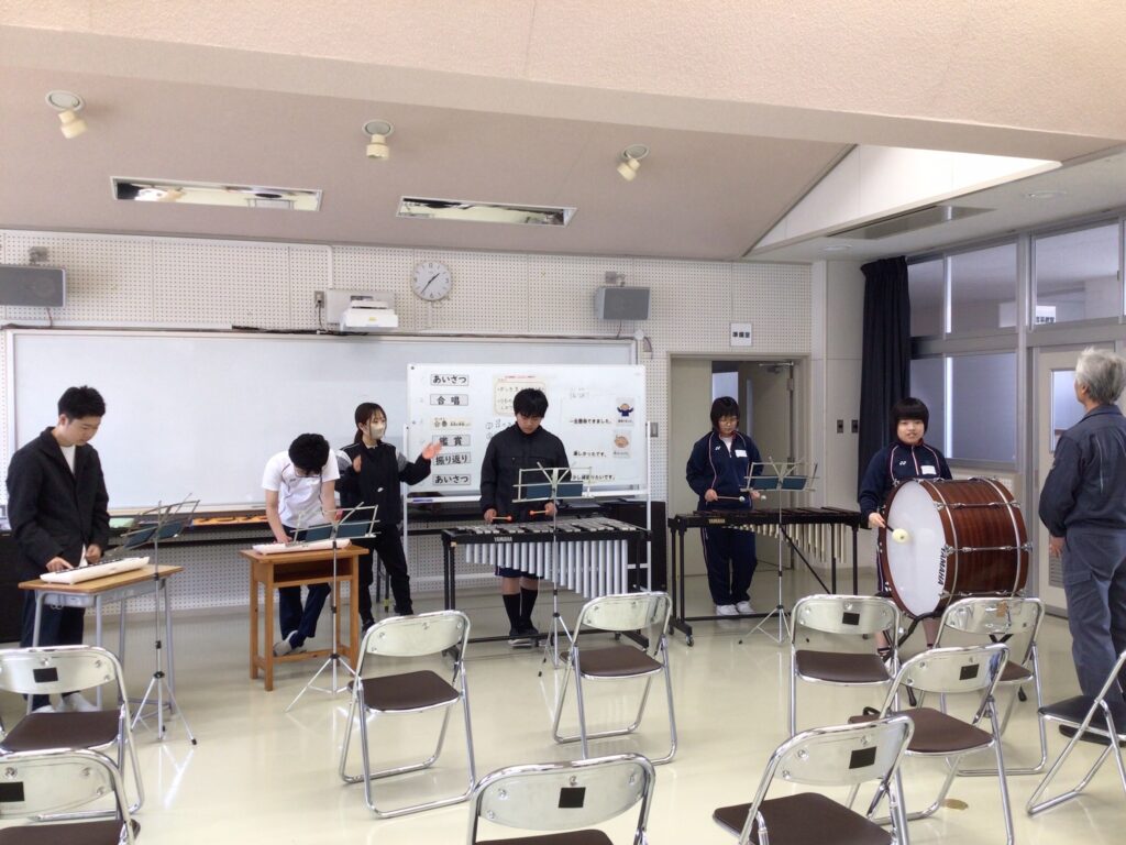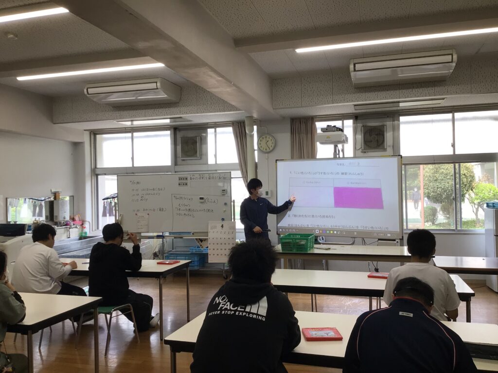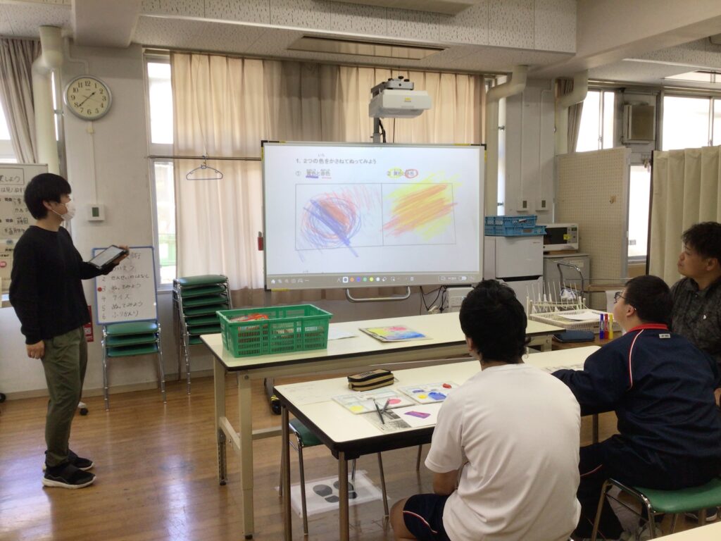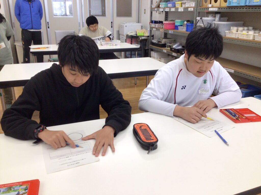 高等部では、月曜日の午後に「芸術」の学習があります。一年生は「音楽」、ニ年生は「美術」、そして三年生はいずれかを自分で選んで決めています。「音楽」では、「マイバラード」を歌ったり「It’s a Small World」の合奏練習に取り組んだりしています。はじめは恥ずかしそうだった生徒も、少しずつ楽器に触れて音を出すたびに、集中して練習する様子が見られました。「美術」では、鉛筆の濃淡を利用して描くため、一本の色鉛筆を使って薄い色と濃い色を使い分ける練習をしました。鉛筆の持ち方を工夫しながら筆圧を調整して丁寧に色をぬっていました。「芸術」教育を通じて、自ら表現する楽しさを味わってほしいと思います。